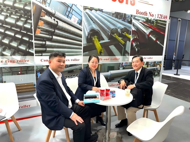 At this German Glasstec glass exhibition, the company displayed a variety of main products, including transition rollers, steel ring rollers, composite ring rollers, asbestos rollers, asbestos-free rollers, calendering rollers, etc.; Among them, the world's longest glass roller (with a total length of more than 9 meters and a roller surface of more than 7 meters) supplied to AGC attracted the attention of all parties.
